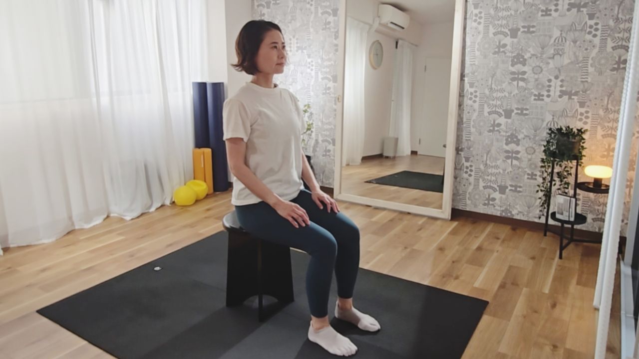 ②背もたれから離れ、頭のてっぺんが天井からそっと引っ張られるイメージ。